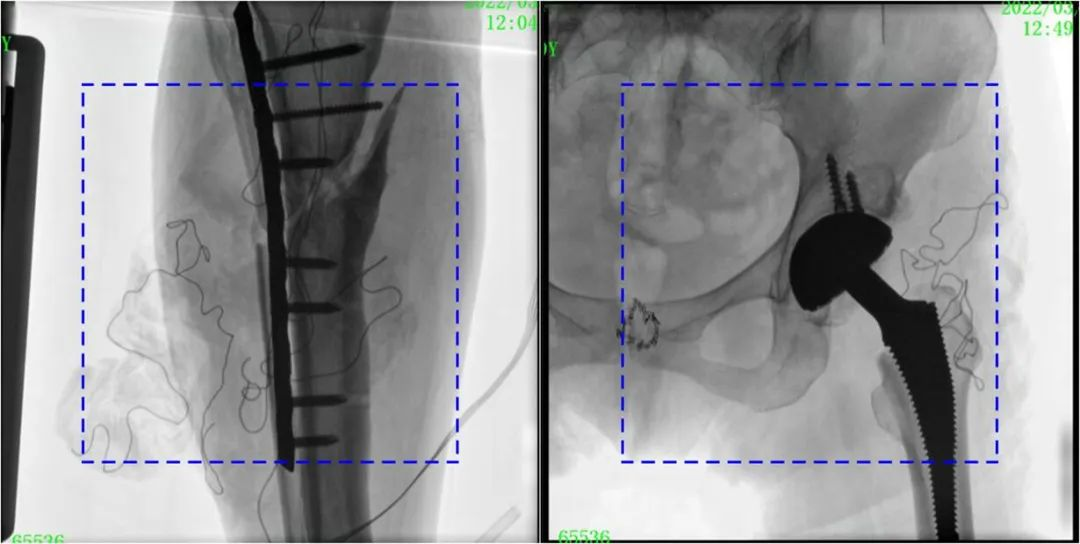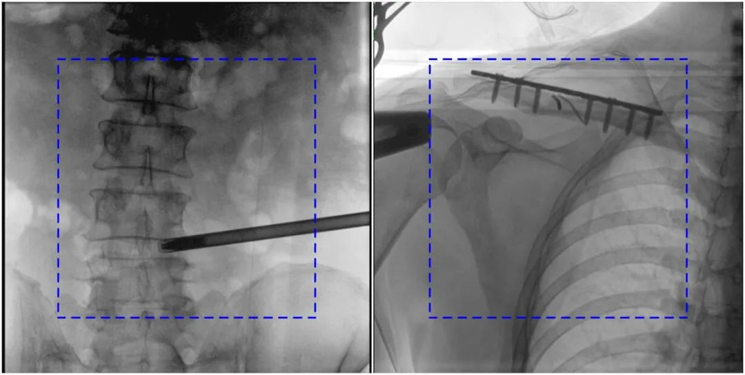 普愛醫(yī)療大平板一體式C形臂圖像與傳統(tǒng)圖像對比(藍色虛線內為傳統(tǒng)21CM×21CM平板的成像區(qū)域)