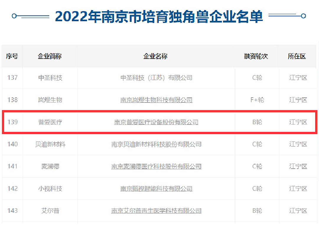 普愛醫(yī)療入選2022年度南京市培育獨(dú)角獸企業(yè)名單